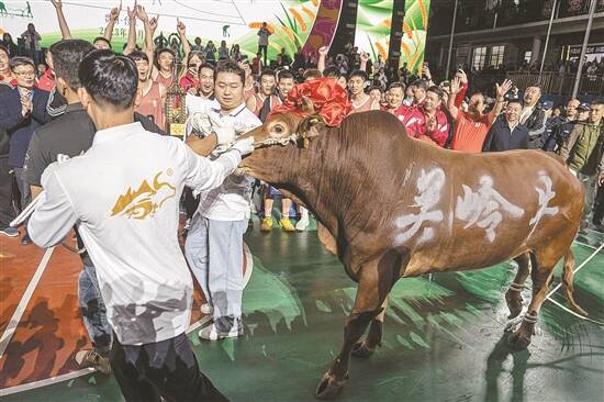 在决赛中,除了两队队员的精彩表现,主办方提供的极具当地特色的奖品也非常吸睛。除了常规的奖杯和证书外,夺冠的广东沙溪队还得到了一头关岭牛、一顶冠军银帽和25份台江鲤吻香米。冯汉远在夺冠后就表示,一定会将这头“冠军牛”送回沙溪。而在比赛结束的第二天,这头牛已经搭上了台江县方面提供的专车,预计于30日抵达沙溪。