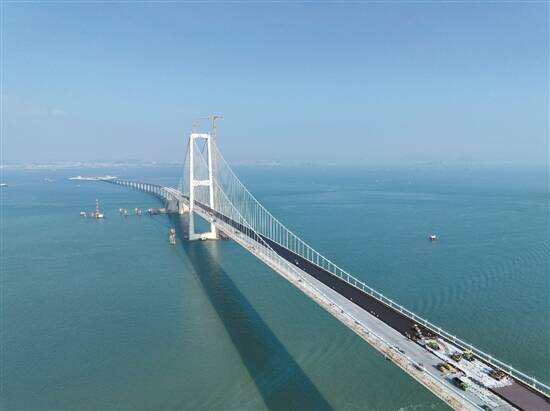 在伶仃洋大桥施工现场,2台摊铺机列队行进,7台压路机来回穿梭,200多名建设者紧锣密鼓进行桥面铺装。在他们身后,黑色沥青路面在伶仃长虹上徐徐展开。