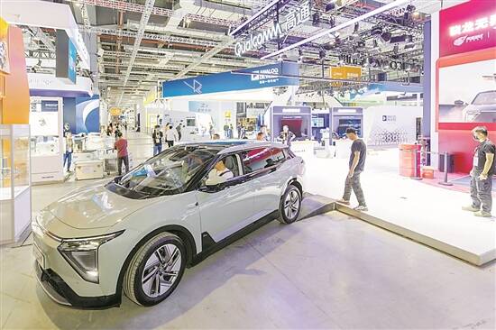 一辆搭载高通芯片的智能电动汽车准备驶向高通展位 新华社发