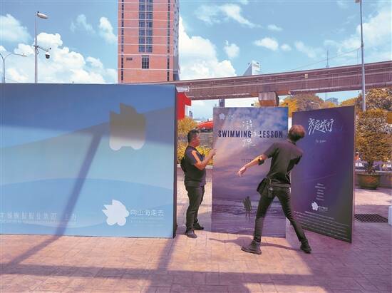 工作人员布置开幕式会场外的海报