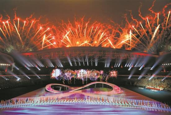 随后,主题为“在青春的赛道上”的文体展演拉开帷幕。文体展演包括《青春的山河》《青春的接力》《青春的奔跑》三个篇章和尾声《青春万岁》,将运动项目、体教元素、文艺元素与广西壮美山水、多彩民族、红色文化、开放发展等元素有机结合。尾声把绿色低碳的点火仪式与表演融合,并推出原创主题歌《以青春的名义》。