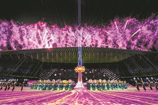 开幕式舞美以赛道的延伸、拓展和螺旋上升为形态,构筑充满想象的青春空间,寓意学生青年一代在赛道上奋勇前行、奔赴未来。