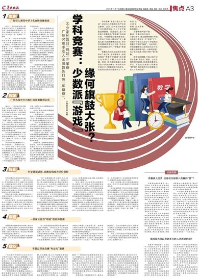 尽管教育专家不断重申,竞赛训练只适合小部分孩子,真正能靠竞赛升学的也是极少数学生,但“诱惑”之下,仍有不少家长从孩子小学起就往竞赛方向盲目“鸡娃”。与此同时,学校竞赛表现已变相成为尖子生和家长选择高中的一大参考依据,为了吸引生源,学校不得不“卷”竞赛。