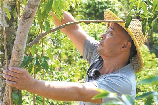 梁兴强为沉香树修剪枝叶