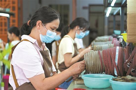 村民在家门口就业,加工沉香木手工艺品