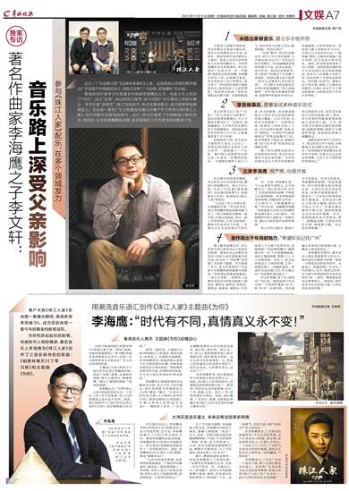 作为著名音乐人,李海鹰创作的《弯弯的月亮》等歌曲早已成为华语经典,近年来,李海鹰还推出了《1921》等交响乐力作。熟悉李海鹰的乐迷也知道,李海鹰还曾为《亮剑》《幸福像花儿一样》《黑冰》等重磅电视剧创作了一系列影视音乐。因此,李海鹰称此次为《珠江人家》撰曲,算是“重操老本行”。