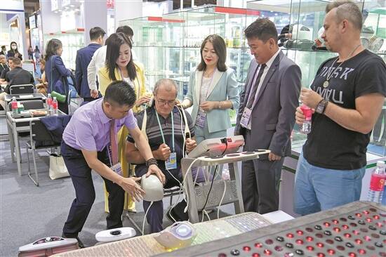 一名境外采购商日前在广交会参展商的帮助下体验一款理疗仪 羊城晚报记者 梁喻 贺全胜 摄
