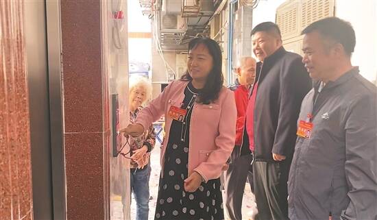 人大代表郑少琼按下按钮,和大家一起启动电梯
