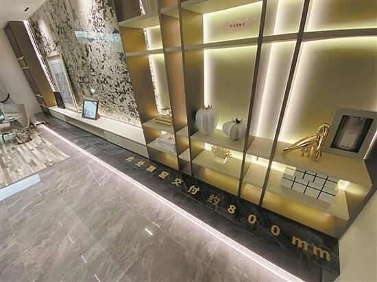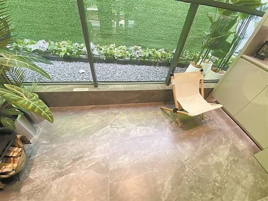 上述楼盘的创意样板房当中,大厅摆放电视机位置的墙面下方就显示“此处飘窗交付约800mm”,另外,该样板房的厨房操作台也由飘窗改造而成,阳台长度为7米,其中还有一部分报建为不计算面积的花池,销售人员称:“业主可以将飘窗改造成样板房的模样,配合大景观阳台,整个大厅的空间将更宽敞。”