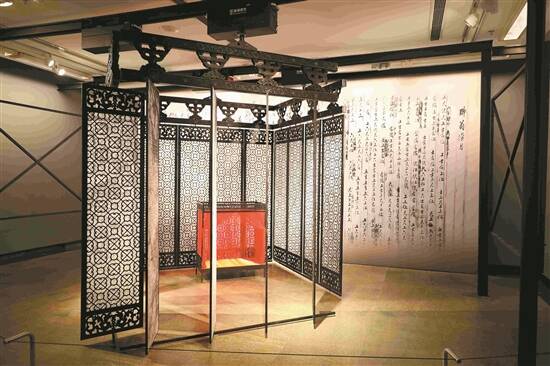 为了更立体地呈现舞台设计的效果,秦立运还将大型的舞台设计装置搬到了展厅,并根据场馆尺寸进行一定程度的等比例缩小。比如舞剧《沙湾往事》中为全剧时空转换及气氛营造提供支撑的十六片隔扇门,被搬到展览现场,这些隔扇门还能进行多角度旋转,尽可能地贴近演出效果。