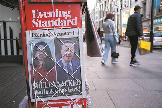 11月13日,英国伦敦,《伦敦旗帜晚报》报道,布雷弗曼被解雇,卡梅伦受命出任外交大臣 视觉中国供图