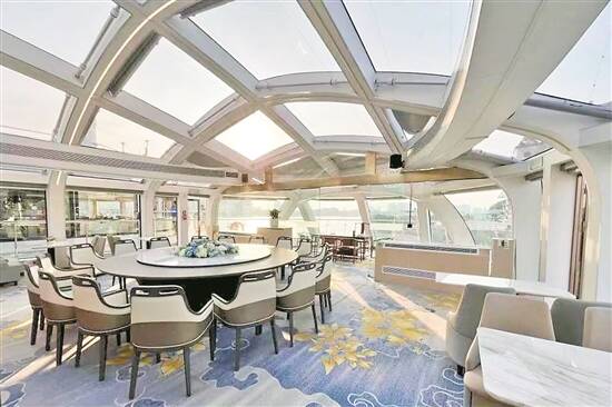 据介绍,“远海启航”号总长49.30米、型宽13.50米,最大客容量为350客位,具备观光游览、接待、商务、庆典等综合功能。“远海启航”号采用锂电池动力,可实现“零排放、低噪音、无污染”航行,游客置身于游船内,将与“绿色”同行,时刻拥有静谧、平稳、舒适的航行体验。游船整体设计融合海丝文化和海洋元素,采用大面积玻璃结构,船内透亮、视野开阔、空间灵动。游客身处其中,便能轻松欣赏珠江美景。