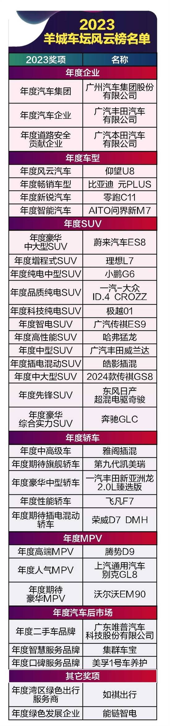 本次2023羊城车坛风云榜通过专业评审,评选出包括“年度汽车品牌”“年度汽车企业”“年度车型”“年度新能源车企业”“年度新能源车型”等多个极具含金量的奖项,并增加不同能源类型的车型评选。