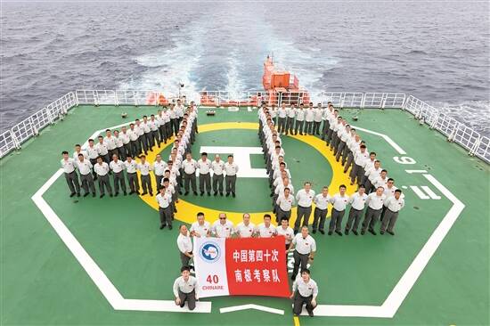 11月10日,中国第40次南极考察队在“雪龙2”号上排列成“40”字样的队形合影留念 新华社发