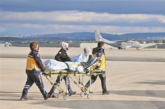 11月20日,在土耳其安卡拉,一名来自加沙的病人被运下飞机 新华社发