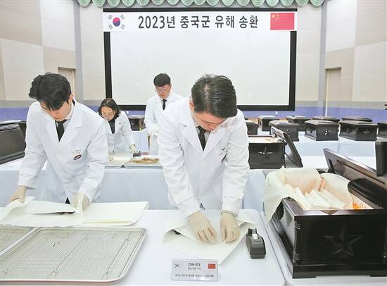 22日,在韩国仁川,韩方工作人员将志愿军烈士遗骸入殓 新华社发