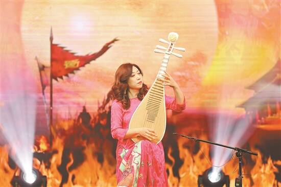 青年五弦琵琶演奏家、传承人马志辉身着马面裙进行非遗表演