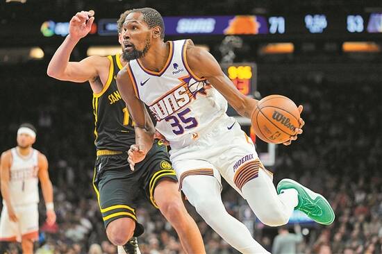 两位超级巨星杜兰特和库里曾经在勇士组成梦幻组合,合作三个赛季全部打进总决赛,夺得两次总冠军,杜兰特获得两次总决赛最有价值球员(FMVP)。太阳本赛季首场常规赛就是客场挑战勇士,尽管太阳获胜,但杜兰特面对老东家发挥失常只拿下18分。