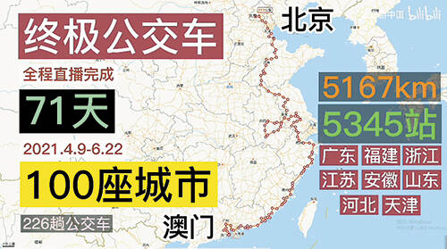 乘坐公交车,从澳门出发,一路向北抵达北京,需要花71天,换乘226趟公交车,途经100多个城市、5345个站台。这是刘华强发布的公交游中国路线中最引人关注的一条。