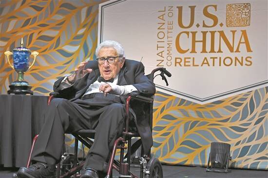 2023年10月24日,基辛格在纽约举行的美中关系全国委员会年度颁奖晚宴上讲话,表示美中和平与合作对世界至关重要