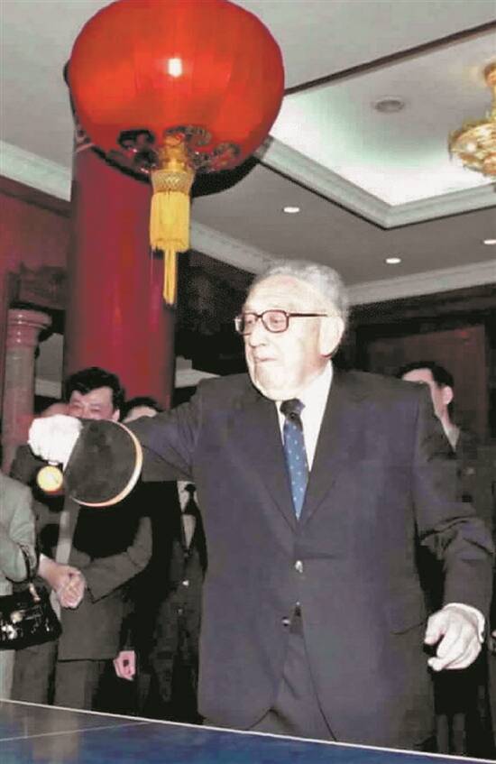 2001年3月18日,基辛格在中国人民对外友好协会纪念中美“乒乓外交”30周年的招待会开始前挥拍助兴
