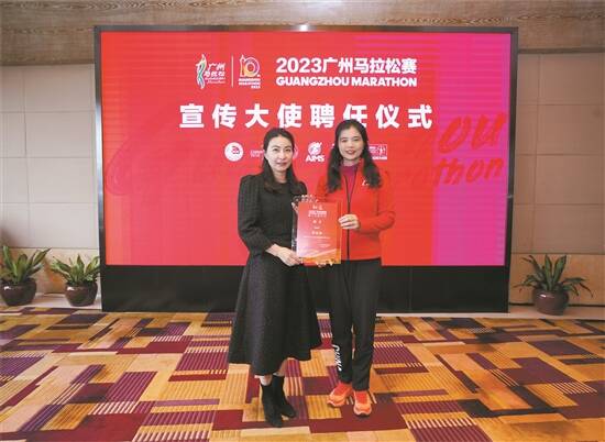 12月2日,广州马拉松赛组委会为2023广州马拉松赛宣传大使郭晶晶举行了聘任仪式。广州马拉松赛组委会常务副主任、广州市体育局局长谭爱英为郭晶晶颁发宣传大使聘书,广州马拉松赛组委会副主任、秘书长、广州市体育局副局长林燕芬为郭晶晶赠送广马十年赛事纪念品。