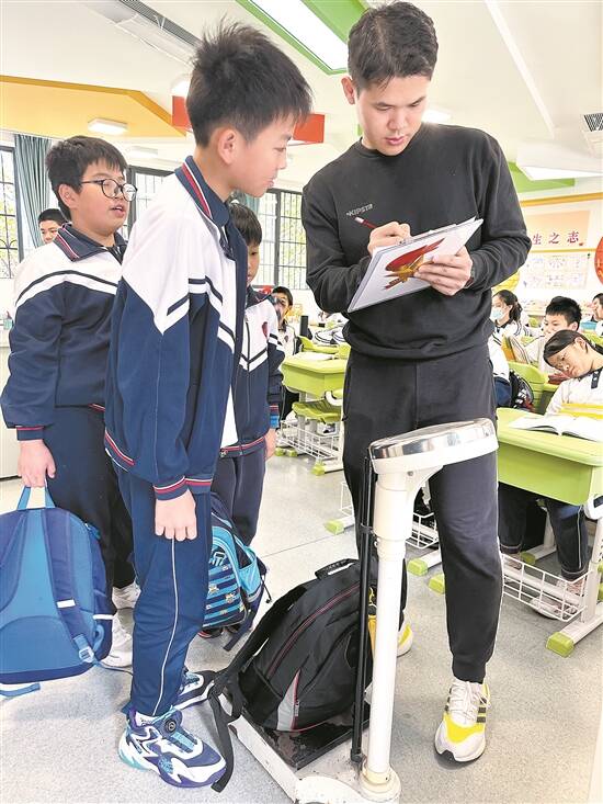 广州市海珠区实验小学行政老师抽检学生书包重量 学校供图