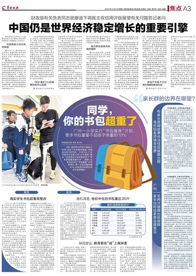 书包,是同学们形影不离的小伙伴,但这个伙伴越来越重,可能成为孩子的负担。12月5日,广州市海珠区实验小学(以下简称“海实”)四年级的4名同学收到了“书包超重整改建议书”。据悉,这是该校实行“书包瘦身”计划两周来,第一次发出整改建议书,后续学校和家长将合作监督整改。