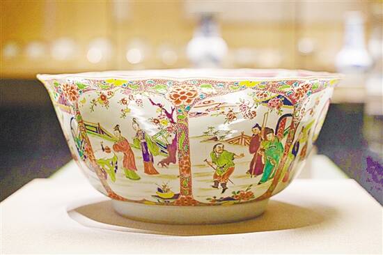“清雍正 粉彩开光《西厢记》人物故事图潘趣大碗”为广东省博物馆所藏。展柜里柔光映照下,可见这件瓷器呈八角形,每个面各绘有一幅《西厢记》人物故事图,色彩绚丽、构图精美……转动碗身,似乎《西厢记》的故事便在碗上徐徐展开。