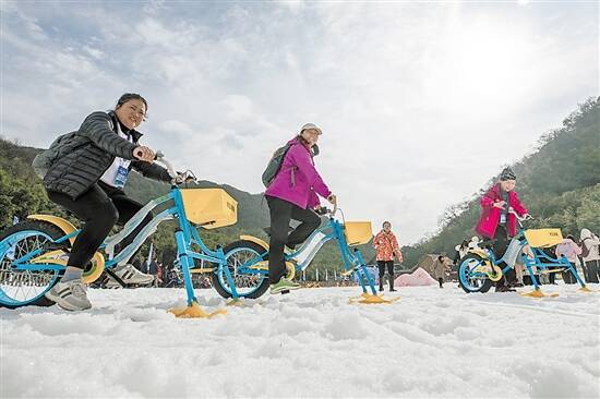 游人在重庆市南川区金佛山北坡滑雪场拍照,体验冰雪乐趣 新华社发
