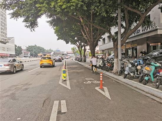 此外,中山大道是城区东西向的重要主干道,路中设有快速公交专用道(BRT),沿线有大量的住宅小区以及学校、商圈,交通繁忙。经长期观察,早高峰期间中山大道东往西方向车流量非常大,该路段部分非机动车道过窄,导致大量非机动车驶入机动车道通行,“机非混行”现象突出。