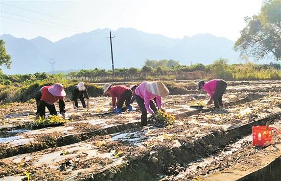 在乐昌长来镇前溪村芥菜生产基地,村民们正在田间地头挥锄开沟、施肥、起垄、播种……一排排紫妃水东芥的幼苗正被有序地种植到田中。“这片基地共30亩,之前种植的是水稻,秋收后,我们基地抓紧部署冬种,在翻整好土地,施好底肥之后,今天开始种植芥菜,预计一周之内可以种完。”基地负责人介绍。
