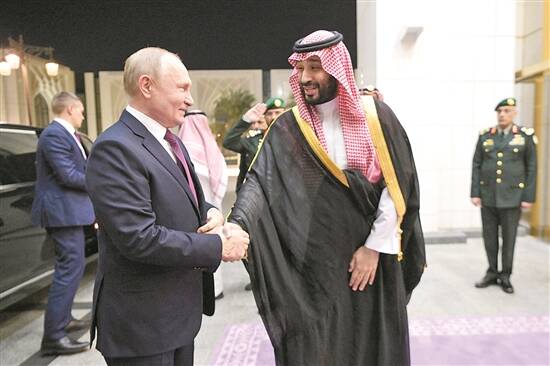 结束对阿联酋的访问后,普京前往沙特首都利雅得,与沙特王储兼首相穆罕默德·本·萨勒曼会谈。沙特通讯社报道,穆罕默德王储强调两国的历史性和牢固的关系,指出苏联是首个承认沙特的国家。