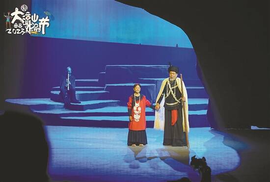 演出中,濮存昕以彝族老人的装扮告诉孩子“要热爱人”,之后又手执弓箭演绎了人与豹的博弈,时而以闲适的戏剧节帽衫示人,时而又以朗读者姿态现身……演员们则身着各民族服饰环坐于舞台,呈现着彝语朗诵、树叶吹奏、原生态合唱、彝族高腔等演出形式,不同民族的原生态艺术与凉山交响乐团的演出交相辉映,含蓄害羞的莫西子诗更以一曲《阿杰鲁》唱出了戏剧之外的另一番天地,整台演出让观众沉浸式聆听了大凉山这片神奇土地发出的最真挚声音。