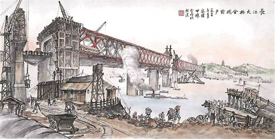 梁世雄、容璞合作 《武汉长江大桥合龙前夕》 纸本设色 41.3cm×81cm 1957年 中国美术馆藏