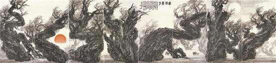 2003年,古稀之年的梁世雄,远赴新疆及中蒙边境收集素材,创作了大量表现胡杨林的巨作。作为祖国西南、西北的边疆景观,其雄奇瑰丽、浩瀚恢宏非传统技法所能囊括,梁世雄正是通过深入生活的探索实践,完成传统中国画语言对于题材表现上的突破,从而进一步拓宽了现代中国画的表现和图式变革,从一定程度上说,这也是他的两位前辈老师关山月、黎雄才西北纪游写生的进一步开拓。
