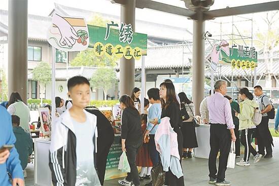 “非遗工匠汇”设置在中心阁门楼、翰墨园、广府园三大园区,分设“曲音曼妙缘丝竹”“墨韵张弛写年华”“府庭满园盈茶香”“绣色聚散裁华衣”“妙手精工章法艺”场景,让观众沉浸式体验绵绵不息的生活情致,领略传统工艺如何焕发新生机。
