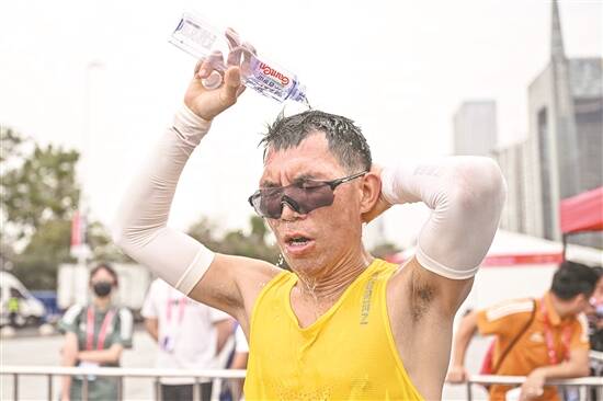 12月10日,广州以29.9℃的温度打破了12月历史高温纪录,除了国家级气象站外,广州多个自动气象站录得30℃或以上气温。图为10日,2023广州马拉松赛跑手淋水降温 羊城晚报记者 钟振彬 摄