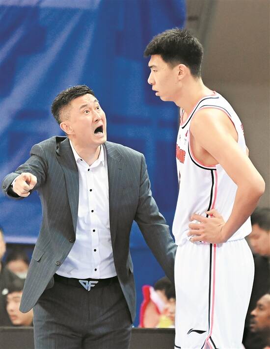 广东队主教练杜锋(左)在场边指导球员徐昕 新华社发