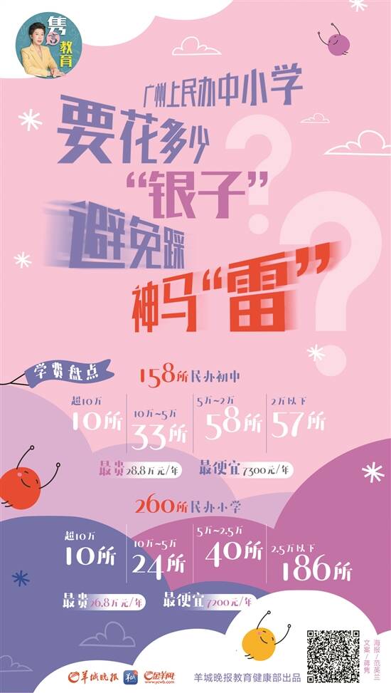 近日,广州市发改委发布了多所民办学校的收费标准批复。羊城晚报记者盘点全市158所民办初中、260所民办小学收费情况发现,民办初中方面,每年学费在10万元以上的学校有10所,115所学校每年学费低于5万元;民办小学方面,每年学费在10万元以上的学校有10所,2.5万元以下的学校有186所。