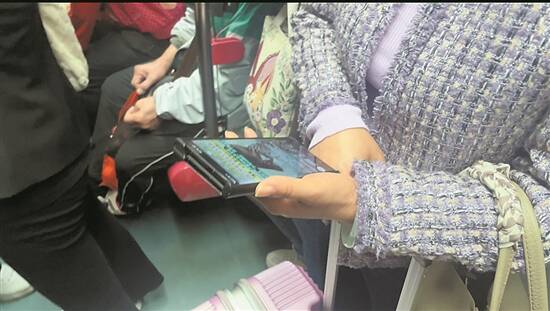 18时,记者深入体育西站这个繁忙的枢纽站,兵分两路乘坐三号线和一号线进行观察。此时正值客流高峰期,地铁车厢内比较拥挤、环境喧嚣,有的乘客在聊天,有的专注地玩手机。在有限的视野范围内,记者仔细观察认真聆听,发现不少中年男性乘客外放手机声音。由于有的外放手机声音过大,不少乘客紧皱眉头将目光锁定在声源处,也有乘客刻意大声叹气进行暗示提醒,但相关行为未被制止。