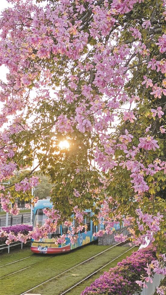 广州海珠有轨电车沿线花朵盛开,美不胜收