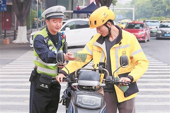 在东风东路与福今路交叉口,记者看到此处设有交通宣传劝导岗。“您好,今天开始东风路白天限行电动自行车,请您绕行或者推行。”数名交警和交通志愿者对过往“电鸡”进行劝导,向车主发放宣传单页,引导其按规出行。
