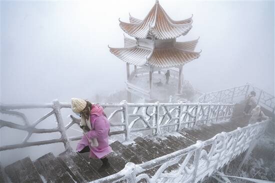 16日早晨,清远金子山出现雾凇云海景观,不少游客在寒风中登山观景 羊城晚报记者 梁喻 摄