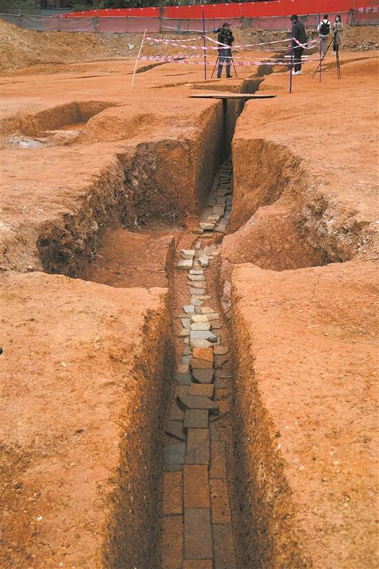 不少晋南朝时期的砖室墓设有造型精美的长排水沟。以编号M7的现场为例,这一东晋时期带墓道的长方形砖室墓由墓道、封门、甬道、前室、后室、排水沟构成。共出土器物6件,包括青釉小碗3件、青釉碗1件,青釉三足砚1件,铜碗1件,排水沟长约35.5米,是本次发掘的较长的排水沟;G6则属于南朝时期,为墓葬所设排水沟,发掘长度约24米。排水沟东侧未砌砖,中西部用四层砖叠砌,在底砖上纵向平放2列榫卯砖,形成宽约10厘米、高约8厘米的排水通道,排水沟中部及东部各设一处砖砌挡墙。