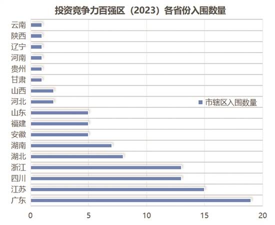 记者梳理发现,今年广东省入围市辖区数量与去年持平,达19个,约占总数五分之一,排名全国第一;江苏省亦不甘落后,有15个市辖区登榜;四川省和浙江省数量持平,均有13个市辖区进入榜单;湖北省、湖南省紧随其后,入围数量分别为8个和7个。