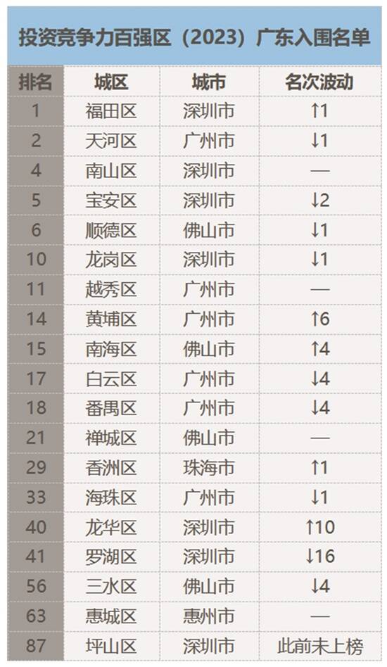 落到本区域,在投资竞争力百强区(2023)中,广东不仅入围选手最多,还包揽了前两名,分别是深圳福田区、广州天河区;另外,深圳南山区、深圳宝安区、佛山顺德区和深圳龙岗区纷纷挤进前十的席位。