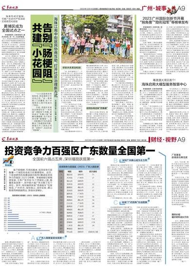 栽下梧桐树,引得凤凰来,投资竞争力是衡量一个城区综合实力的重要指标。近日,工信部研究机构赛迪顾问发布《赛迪投资竞争力百强区(2023)》榜单。羊城晚报记者梳理发现,今年广东共有19个市辖区入围,数量居全国第一,其中前六强广东占据了五个席位。其中,深圳福田实现“弯道超车”位居榜首,广州天河、深圳南山、深圳宝安、佛山顺德同样脱颖而出,跻身头部梯队。