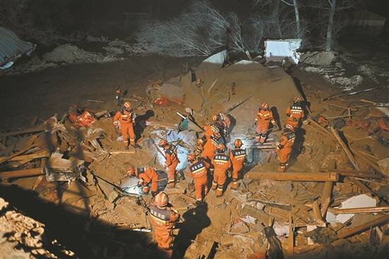 19日,在青海省海东市民和回族土族自治县中川乡草滩村,海东市消防救援支队队员在搜救。积石山6.2级地震已造成青海14人丧生 新华社发