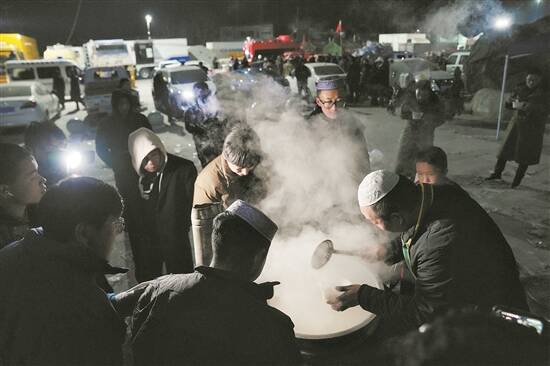19日23时许,甘肃省积石山县大河家镇安置点,热腾腾的食物供应 周巍 摄